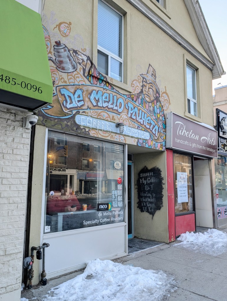 - Lazy Daisy’s Café (1515 Gerrard Street East) – Visited February 2026. This is more of a brunch spot than a coffeehouse. I ordered brunch and a drip black coffee. Really underwhelming- the coffee was tasteless and the brunch plate (“Standard Brekkie”) consisted of two slices of toast, two eggs, half of a slice of cantaloupe and a mountain of home fries.