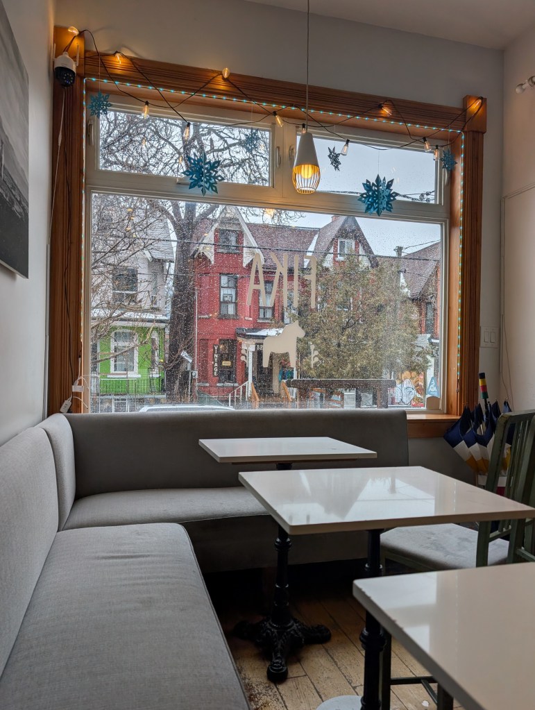 - Forget Me Not Coffee (102 Ossington Ave) – Visited February 2026. Ordered an Iced Matcha Latte- not the best: proportionally too much milk, making it slightly tasteless. This said- very cute interior with lots of seating; it was decorated with handmade paper streamers for Valentine’s day. I also understand that the café hosts a lot of community events, which I appreciate. I’d go back and try a different drink!