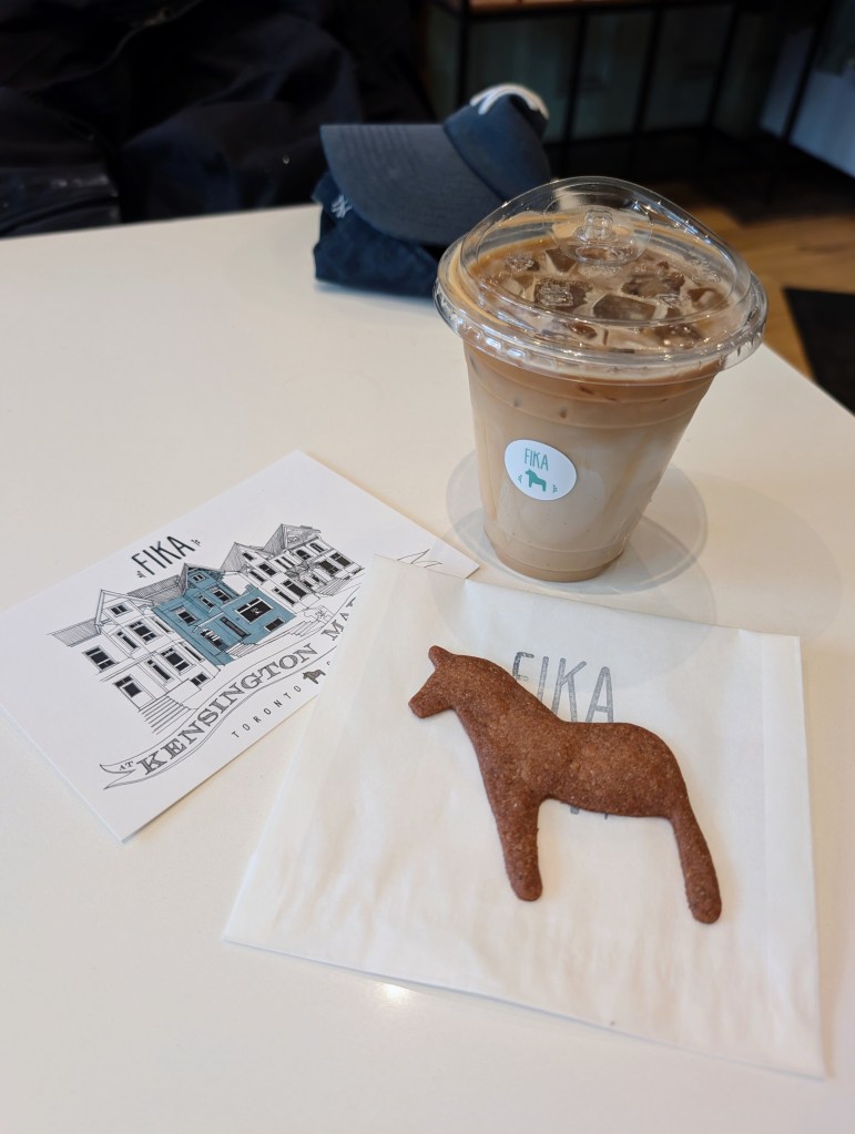 - FIKA Café (28 Kensington Ave)- Visited February 2026, but have been a number of times in the past. FIKA has always been one of my favourite cafés in the city- super cute and cozy. I ordered an iced oat latte and a signature ginger cookie shaped like a dala horse (the café’s logo).